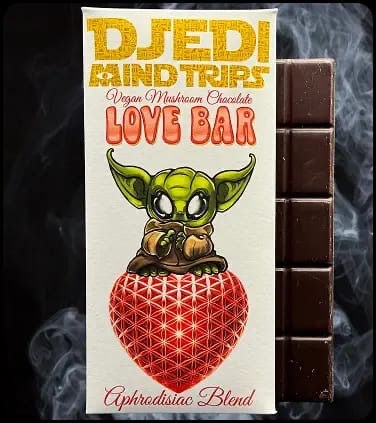 Today we’re talking about two of their standout creations: the Djedi Mind Trips Aphrodisiac Mushroom Chocolate Love Bar and the Aura Cosmic Trip Gummies. These aren’t your typical glossed-over “healthy treats.” They’re little invitations into worlds you forgot existed, the ones where pleasure, balance, and curiosity coexist.