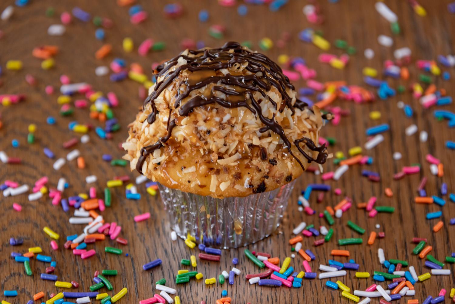The Hostess Cupcake has a creamy middle and a delicious chocolate cake with a swirl on top. The Samoa/Caramel Delight has vanilla cake, vanilla buttercream, toasted coconut, a drizzle of caramel, and chocolate ribbons.